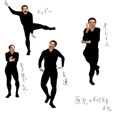 丼からFUJIWARAの原西ギャグ集を描いてくれって頼んだら快く引き受けてくれたらしく、こんなに素晴らしい作品を提示していたので、横取りしてきました。ゴメンね!それにしても今にも動き出しそうだなこの原西たちは。丼の絵は生命力が湧き出てる。生命の息吹を感じるよ。すげーす☆